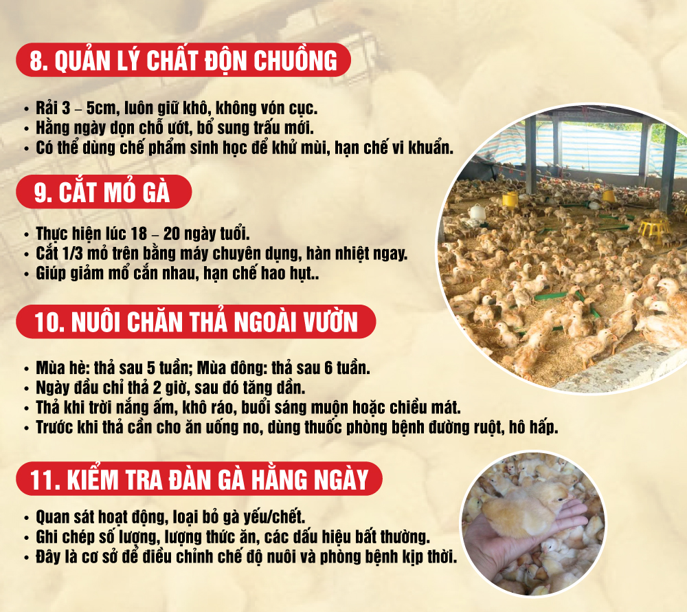 - Hằng ngày kiểm tra, loại bỏ chỗ ướt, bổ sung trấu mới.
