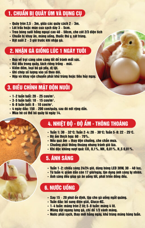 - Khi tiếp nhận, cần rải đều gà trong quây, tách riêng gà trống – mái để quản lý dễ hơn.