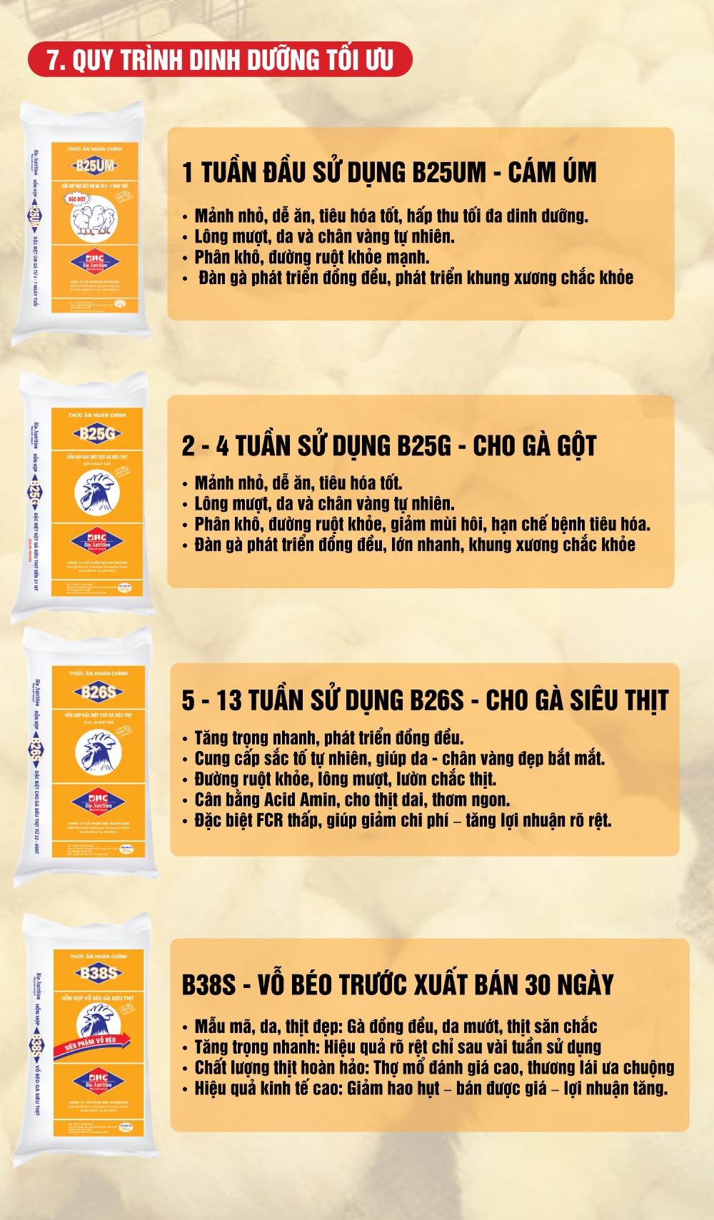 Từ tuần 2 – tuần 4 chuyển sang cám B25G sản phẩm tối ưu cho giai đoạn sinh trưởng đầu. B25G có hàm lượng dinh dưỡng cân đối, giúp gà tăng trọng nhanh, khung xương chắc khỏe, lông mượt và phát triển đồng đều trong đàn.