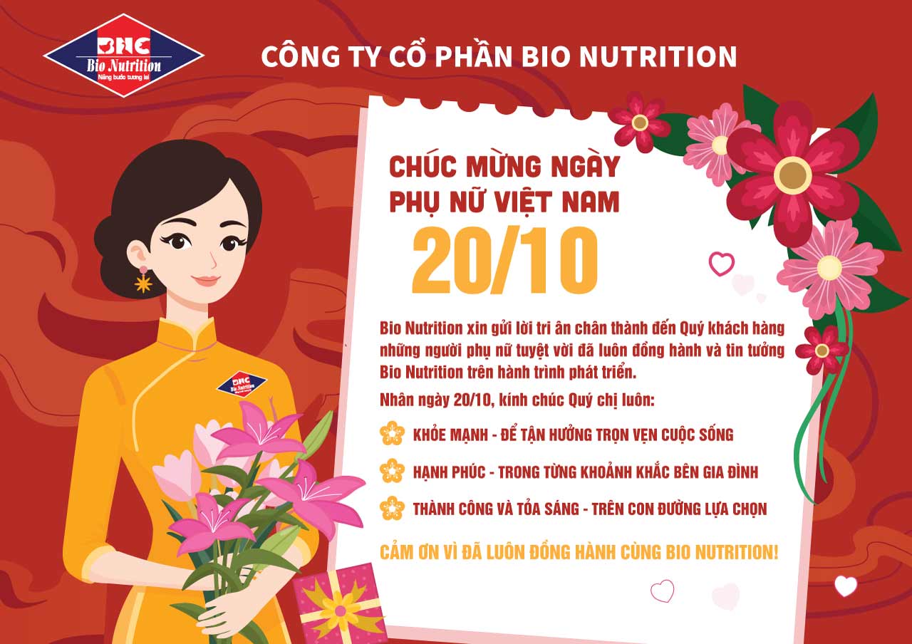 Nhân dịp Ngày Phụ nữ Việt Nam 20/10, Công đoàn và Ban lãnh đạo Bio Nutrition xin gửi tới toàn thể CBCNV nữ, cùng gia đình các CBCNV đang làm việc tại công ty, lời chúc mừng nồng nhiệt và tốt đẹp nhất: