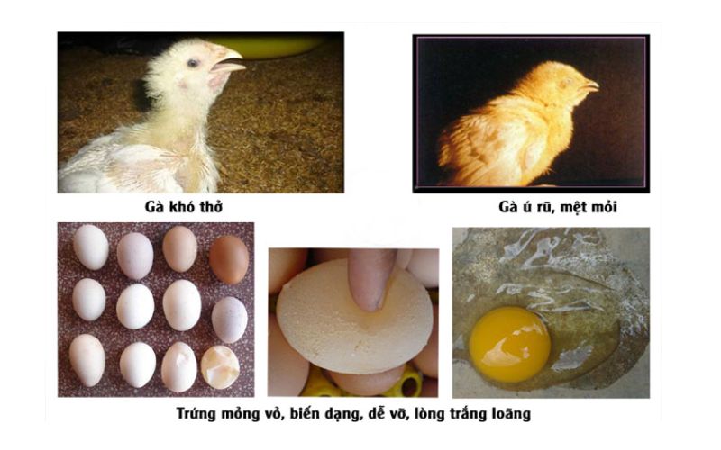 - Tỷ lệ đẻ sụt giảm mạnh, đẻ trứng dị hình, méo mó (hình quả xoài), vỏ trứng mỏng hay lăn tăn gợn sóng và thường mất màu, to nhỏ không đều.